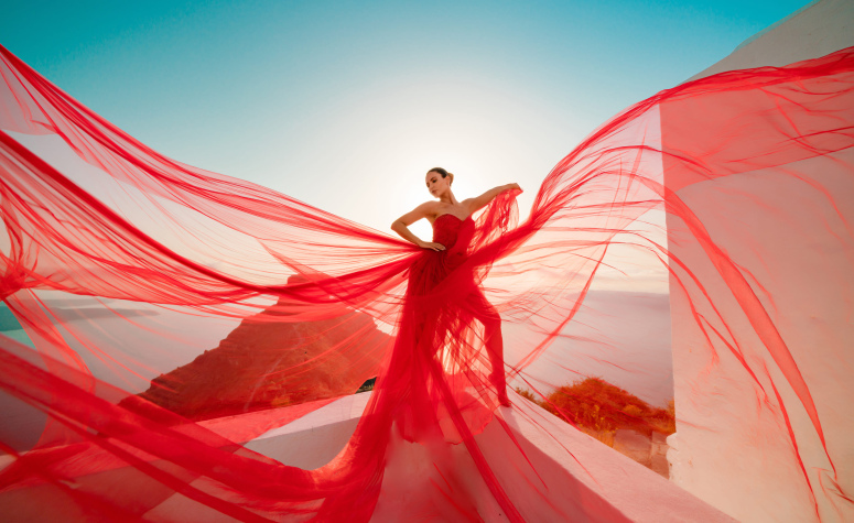 While those who really wish to let go of the issues of arranging a private flying dress photoshoot in Santorini will appreciate our Santorini Dress photoshoot price. Let the professional team do their best and indulge yourself in the role of a beauty queen on your Santorini vacation.